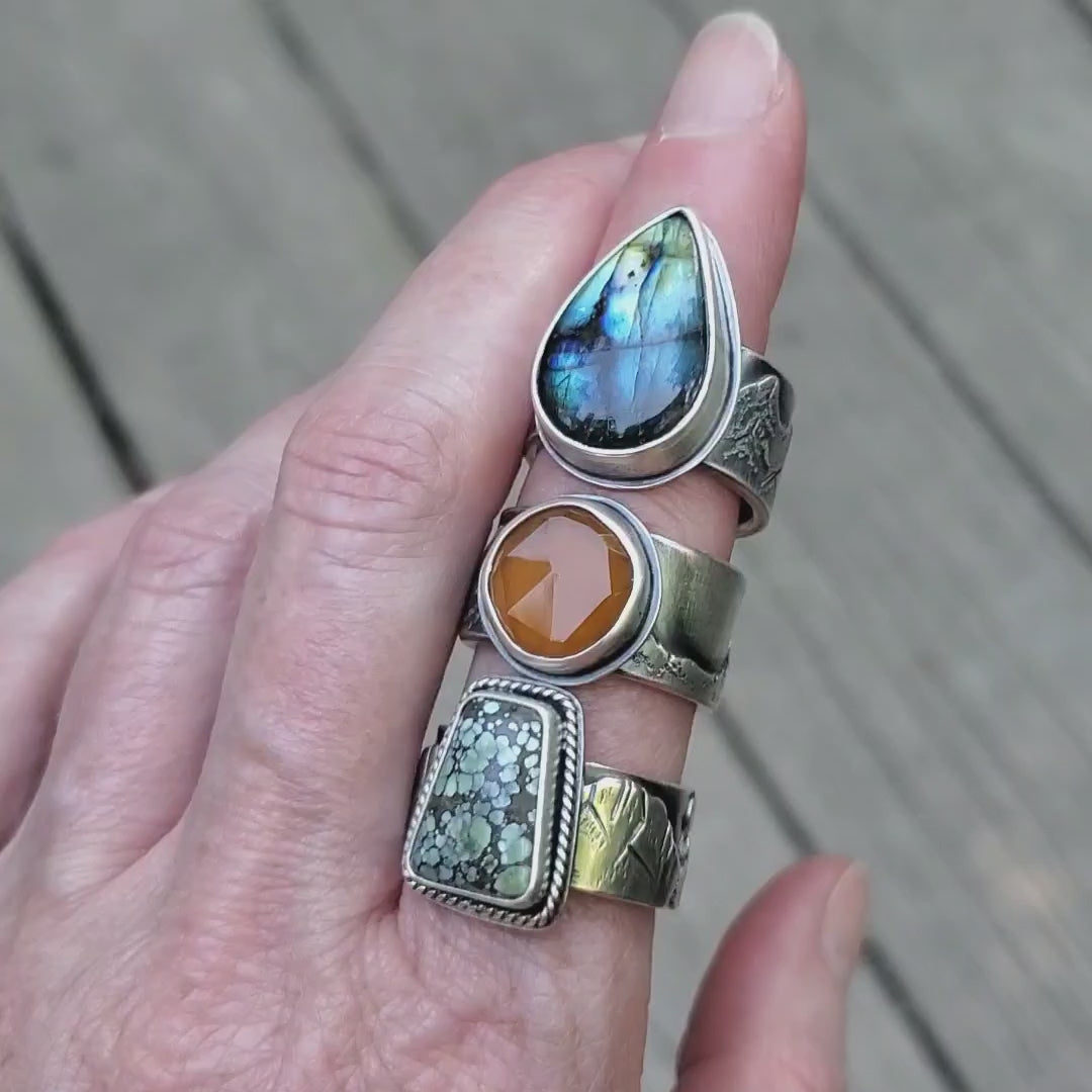 A beautiful Star Fox Variscite stone graces this wide band ring featuring a scenic night-time mountain landscape along the band. I added a small twist wire around the setting giving this ring a bit of western-rustic feel. The mountains were hand sawn and textured, and small evergreen trees were stamped along the band to remind you of your favorite mountain get-away.
