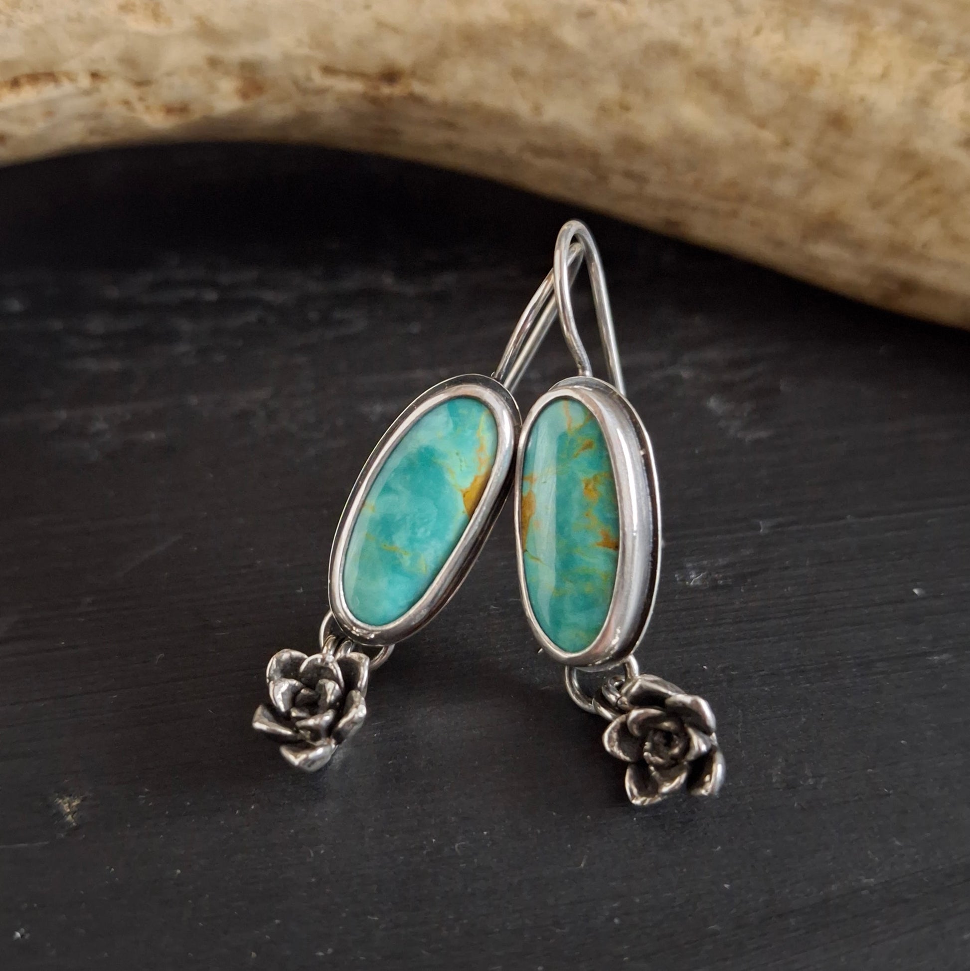 These earrings pair smooth Kingman turquoise ovals with small cast sterling silver succulents that sway gently below. Each detail is shaped and finished by hand, balancing simplicity with a touch of wild beauty.