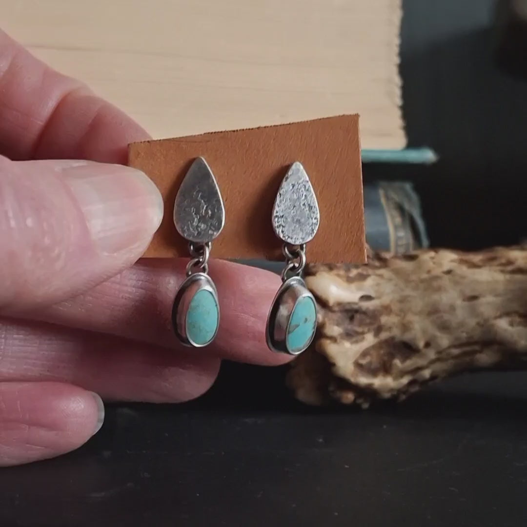 Beautiful ovals of Kingman turquoise dangle and sway from textured sterling silver raindrops. These are post earrings so the raindrops stay stationary while the turquoise is meant to have all the movement.