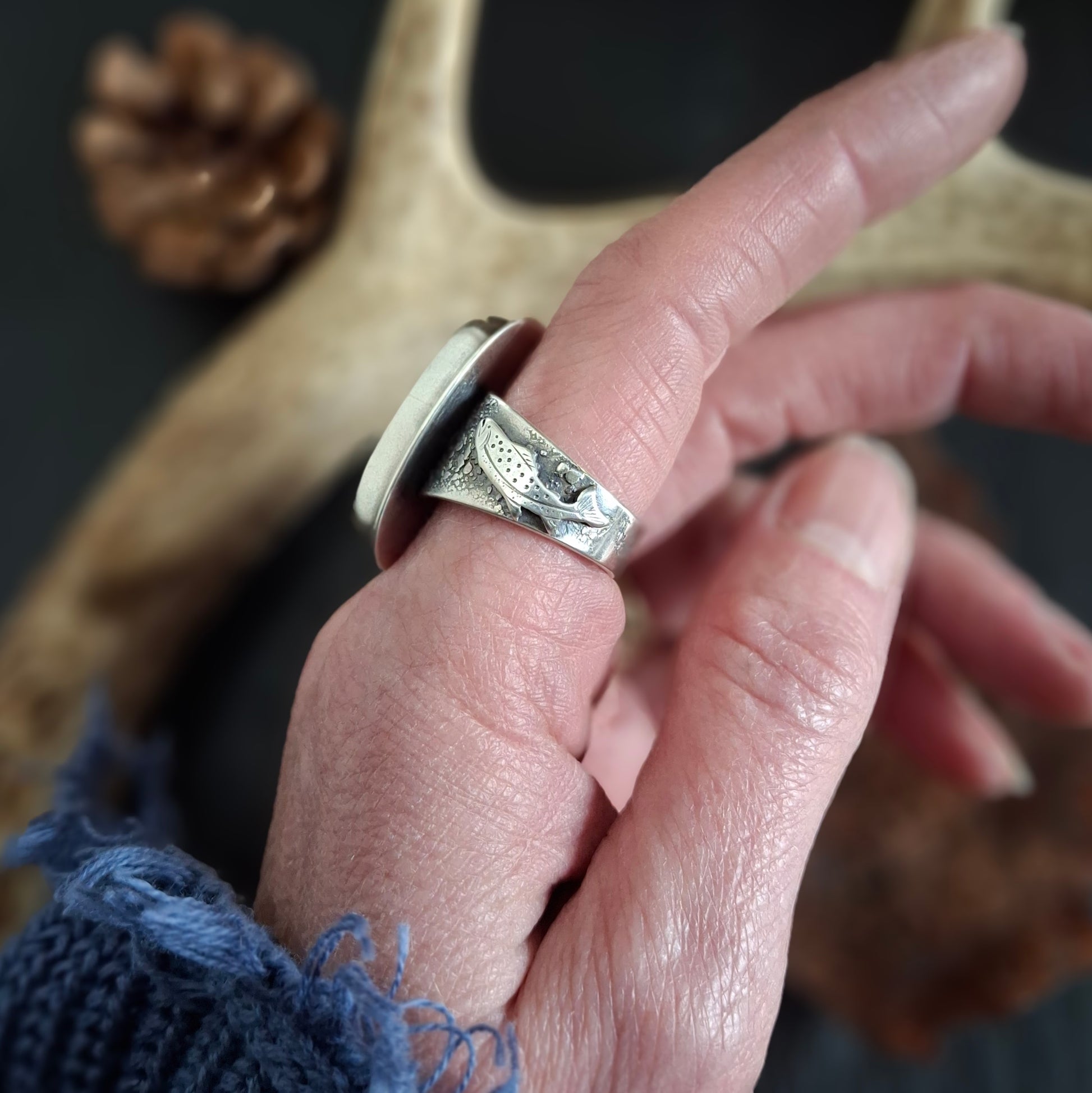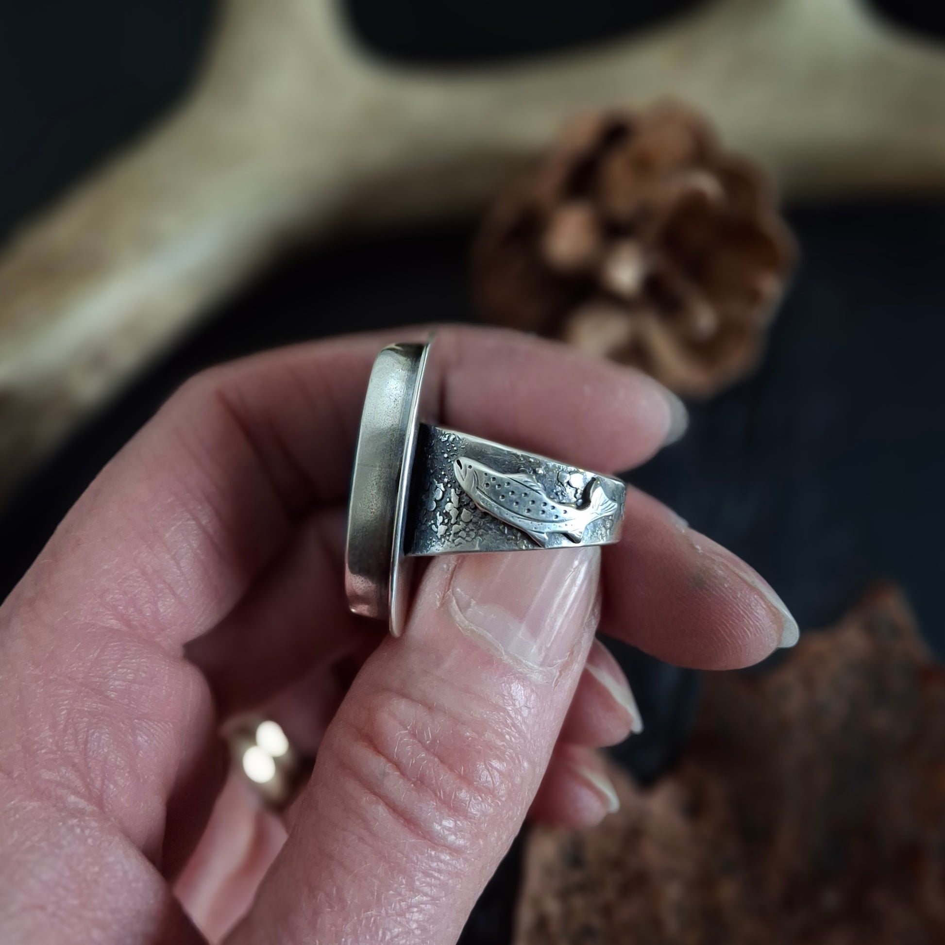 A little piece of the wild for your hand. This wide, fused silver textured band which gives it character and depth, features a bold Tibetan turquoise stone at its center. Along one side, a delicate hand-sawn trout swims, a quiet nod to nature’s serenity and freedom.